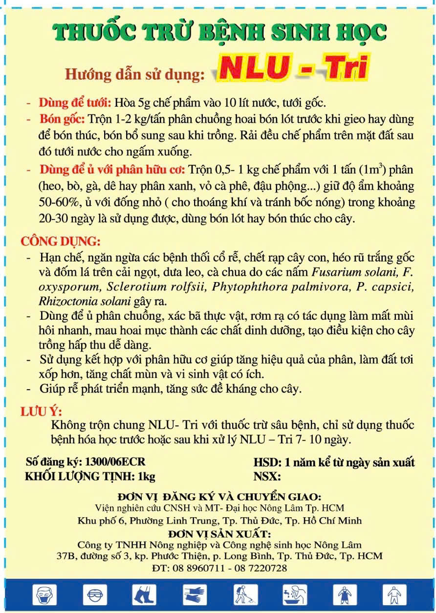 NLU – Tri là chế phẩm sinh học dùng trong canh tác nông nghiệp, hỗ trợ phòng và hạn chế các bệnh do nấm trong đất, giúp bộ rễ phát triển khỏe, cây sinh trưởng ổn định. Sản phẩm có thể dùng để tưới gốc, bón đất hoặc ủ chung với phân hữu cơ nhằm cải tạo đất, tăng vi sinh vật có lợi và nâng cao hiệu quả sử dụng phân bón. Phù hợp cho nhiều loại cây trồng như rau màu, cây ăn trái và cây công nghiệp.